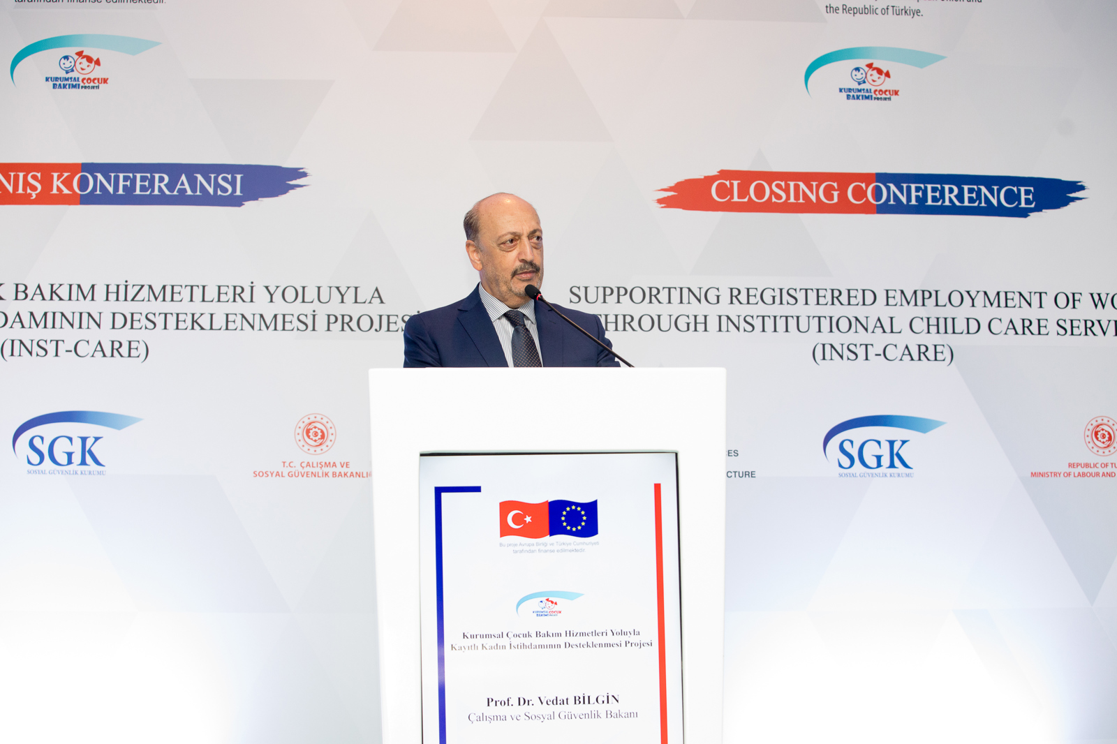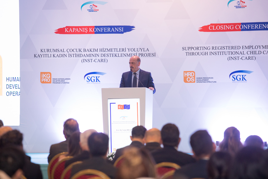 Çalışma ve Sosyal Güvenlik Bakanı Vedat Bilgin, Çalışma ve Sosyal Güvenlik Bakanlığı Sosyal Güvenlik Kurumu ile Avrupa Birliği iş birliğinde düzenlenen Kurumsal Çocuk Bakım Hizmetleri Yoluyla Kayıtlı Kadın İstihdamının Desteklenmesi Projesi’nin Kapanış Konferansı’na katıldı.